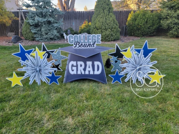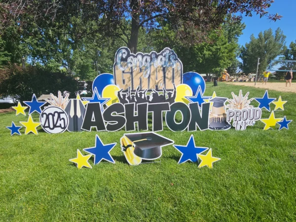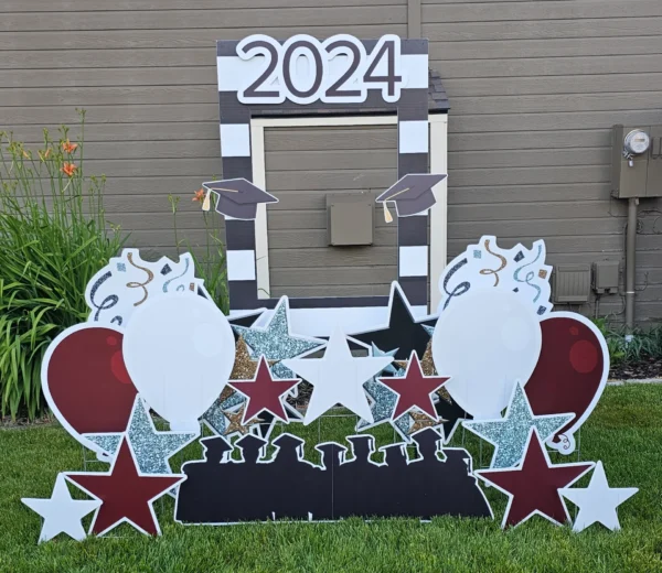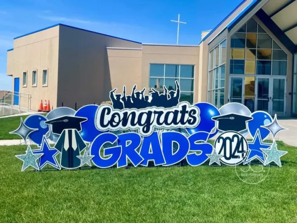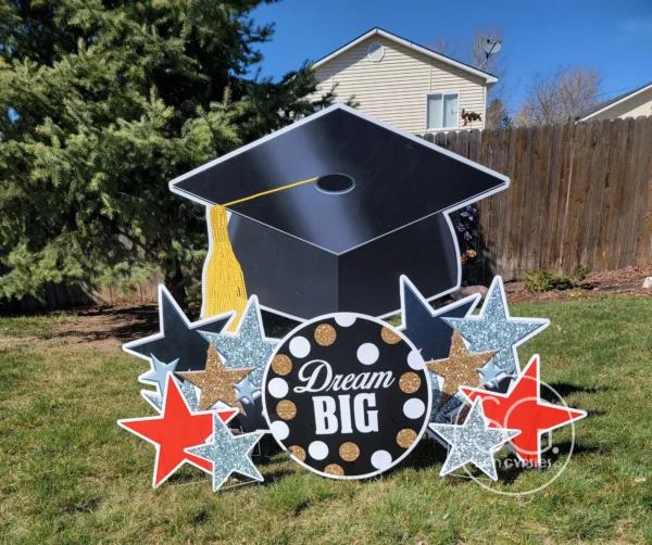 Our mega grad cap is over 4′ wide. Exact graphics will vary and will match the main sign. Subject to availability.